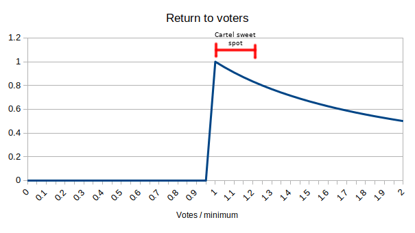 But it gets worse. At this point, there's an incentive for delegates to form alliances (aka political parties, aka cartels) to coordinate their share percentages; this reduces losses to the cartel from chaotic competition that accidentally leads to some delegates not getting enough votes. Once a cartel is in place, it can start bringing its share percentages down, as dislodging it is a hard coordination problem: if a cartel offers 80%, then a new entrant offers 90%, then to a voter, seeking a share of that extra 10% is not worth the risk of either (i) voting for someone who gets insufficient votes and does not pay rewards, or (ii) voting for someone who gets too many votes and so pays out a reward that's excessively diluted.