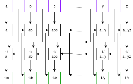 Using Montgomery batch inversion to compute modular inverses. Inputs purple, outputs green, multiplication gates black; the red square is the only modular inversion.