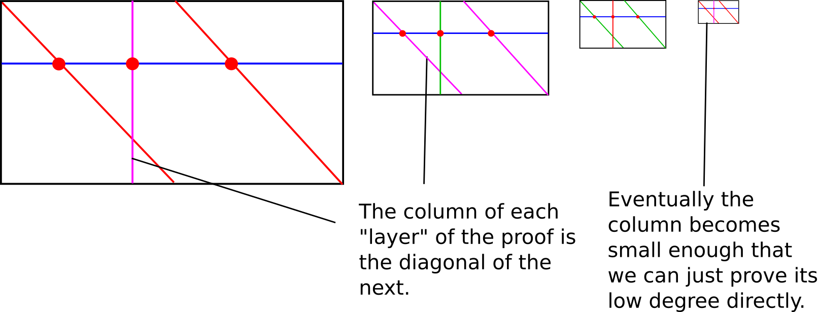 Our approach is a recursive one, with two cases. First, if the degree is low enough, we just provide the entire list of values as a proof; this is the "base case". Verification of the base case is trivial: do an FFT or Lagrange interpolation or whatever else to interpolate the polynomial representing those values, and verify that its degree is \(< N\). Otherwise, if the degree is higher than some set minimum, we do the vertical-and-diagonal trick described at the bottom of Part 2.
