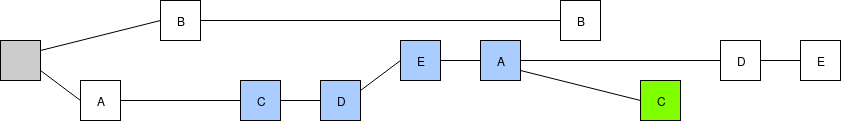 We will take this one step at a time. First, we replace the fork choice rule (the rule that chooses which chain among many possible choices is "the canonical chain", ie. the chain that users should care about), moving away from the simple longest-chain-rule and instead using "latest message driven GHOST". To show how LMD GHOST works, we will modify the above example. To make it more concrete, suppose the validator set has size 5, which we label \(A\), \(B\), \(C\), \(D\), \(E\), so validator \(A\) makes the blocks at slots 0 and 5, validator \(B\) at slots 1 and 6, etc. A client evaluating the LMD GHOST fork choice rule cares only about the most recent (ie. highest-slot) message (ie. block) signed by each validator:
