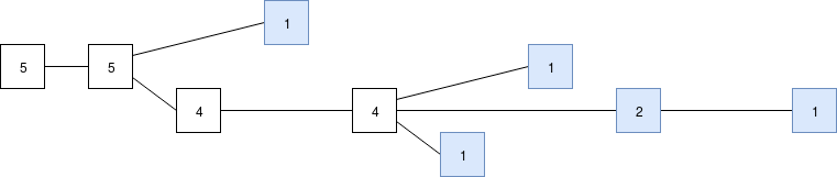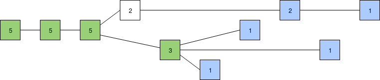 Scoring blocks by number of supporting latest messages and using the GHOST rule (latest message from each validator shown in blue). The bottom chain has more recent support, so if we follow the LMD GHOST rule the bottom chain wins, though it's not yet clear which of the three blocks takes precedence.