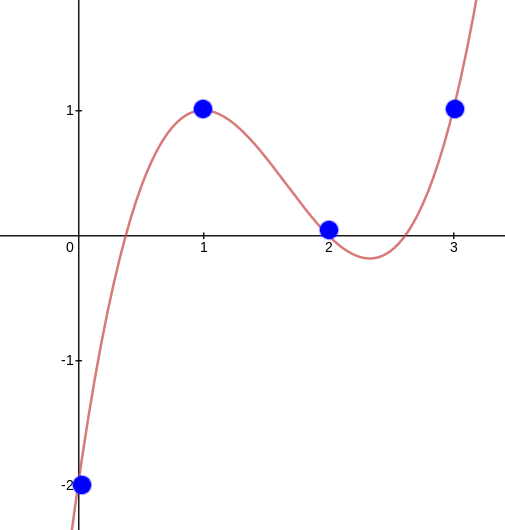 But we can also view polynomials in "evaluation form". For example, we can think of the above as being "the" degree \(< 4\) polynomial with evaluations \((-2, 1, 0, 1)\) at the coordinates \((0, 1, 2, 3)\) respectively.