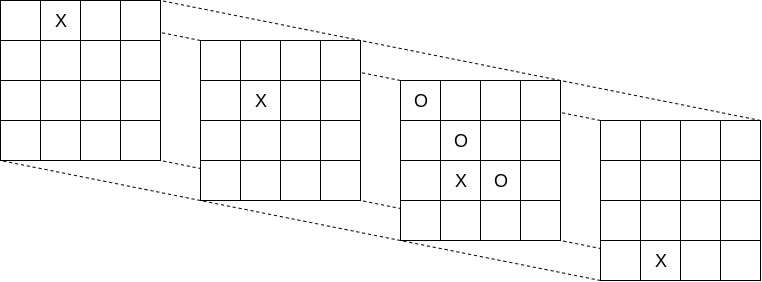 The goal here is to get 4 in a straight line, where the line can go in any direction, along an axis or diagonal, including between planes. For example in this configuration X wins: