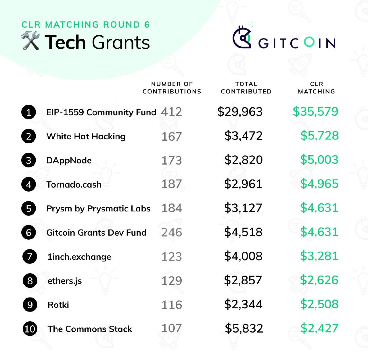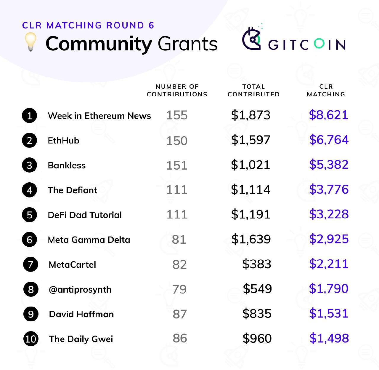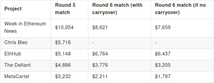 2020 Jul 22 See all postsRound 6 of Gitcoin Grants has just finished, with $227,847 in contributions from 1,526 contributors and $175,000 in matched funds distributed across 695 projects. This time around, we had three categories: the two usual categories of "tech" and "community" (the latter renamed from "media" to reflect a desire for a broad emphasis), and the round-6-special category Crypto For Black Lives.