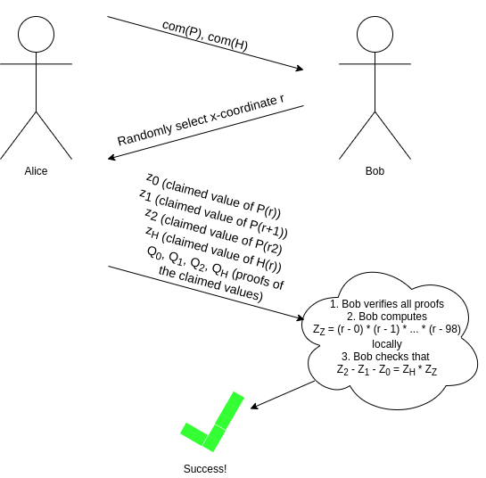 rthemselves by settingr = hash(com(P), com(H))(wherehashis any cryptographic hash function; it does not need any special properties). The prover cannot "cheat" by pickingPandHthat "fit" at that particularrbut not elsewhere, because they do not knowrat the time that they are pickingPandH!A quick recap so far