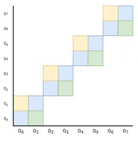 The prover could, of course, just provide \(\{c_0 ... c_{n-1}\}\) directly and let the verifier check the commitment. But this takes too much space. So instead, we try to reduce the problem to a smaller problem of half the size. The prover provides two points, \(L\) and \(R\), representing the yellow and green areas in this diagram: