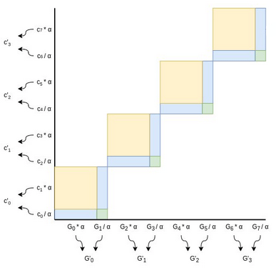 Choose a random factor \(\alpha\) (typically, we set \(\alpha\) to be the hash of all data added to the proof so far, including the \(L\) and \(R\), to ensure the verifier can also compute \(\alpha\)). Every even \(G_i\) point gets scaled by \(\alpha\), every odd \(G_i\) point gets scaled down by the same factor. Every odd coefficient gets scaled up by \(\alpha\) (notice the flip), and every even coefficient gets scaled down by \(\alpha\). Now, notice that:
