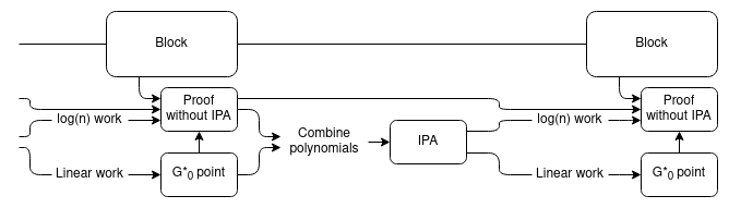 The precise details are somewhat different from the exact proof-combining trick in the previous section for efficiency reasons. Instead of using the proof-combining trick to combine multiple proofs, we use it on a single proof, just to re-randomize the point that the polynomial committed to by \(G^*_0\) needs to be evaluated at. We then use the same newly chosen evaluation point to evaluate the polynomials in the proof of the block's correctness, which allows us to prove the polynomial evaluations together in a single IPA.