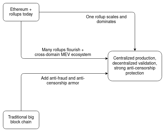 While there are many paths toward building a scalable and secure long-term blockchain ecosystem, it's looking like they are all building toward very similar futures. There's a high chance that block production will end up centralized: either the network effects within rollups or the network effects of cross-domain MEV push us in that direction in their own different ways. But what we can do is use protocol-level techniques such as committee validation, data availability sampling and bypass channels to "regulate" this market, ensuring that the winners cannot abuse their power.