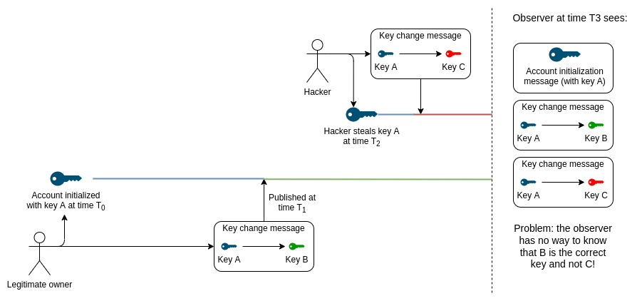 But notice that even for these simpler key change scenarios, you can't just use cryptography. Consider the following sequence of events: