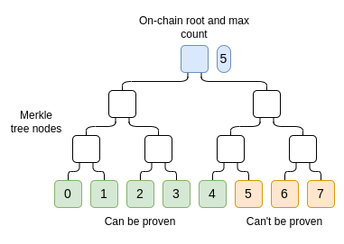 By publishing a single Merkle root and max count on-chain, you can commit issue a limited quantity of attestations. In this example, there are only five possible valid Merkle branches that could satisfy the proof check. Astute readers may notice a conceptual similarity to Plasma chains.