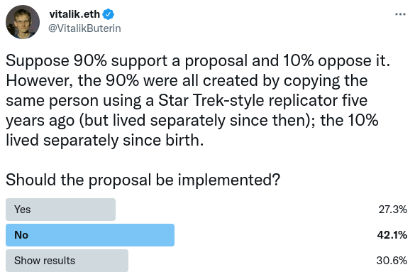 One key goal of the Decentralized Society paper is the idea that it should be possible to make calculations over the graph of attestations. A really important one is measuring decentralization and diversity. For example, many people seem to agree that an ideal voting mechanism would somehow keep diversity in mind, giving greater weight to projects that are supported not just by the largest number of coins or even humans, but by the largest number of truly distinct perspectives.