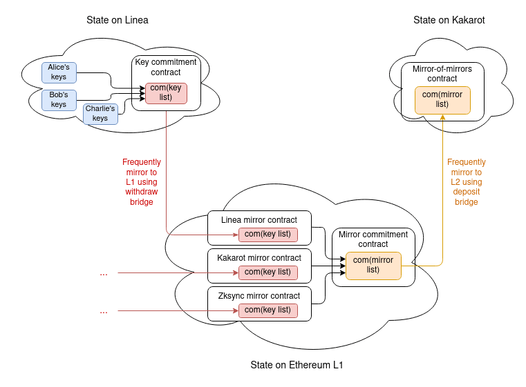 com(key list)on the keystore-holding L2 (48 bytes)com(key list)being a value insidecom(mirror_list), the commitment to the list of all key list comitments (48 bytes)com(key list)(48 bytes, plus 4 bytes for the index)It's actually possible to merge the two KZG proofs into one, so we get a total size of only 100 bytes.