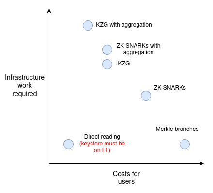 Notice that if the keystore is on L1, and L2s integrate L1 static-call functionality, then no proofs are required at all! However, if L2s don't integrate L1 static-calls, or if the keystore is on L2 (which it may eventually have to be, once L1 gets too expensive for users to use even a little bit), then proofs will be required.