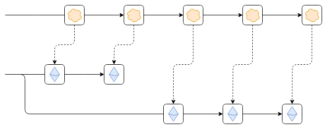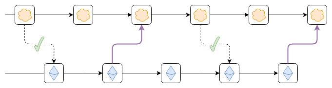 The purple links can be either hash links or a bridge contract that verifies Ethereum's consensus.