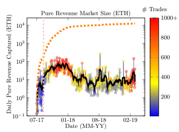 T, the USD/ETH exchange rate - on centralized exchanges and on Uniswap - is $3000. At timeT+11, the USD/ETH exchange rate on centralized exchanges rises to $3005. But Ethereum has not yet had its next block. At timeT+12, it does. Whoever creates the block can make their first transaction be a series of Uniswap buys, buying up all of the ETH available on Uniswap at prices from $3000 to $3004. This is extra revenue, and is called MEV. Applications other than DEXes have their own analogues to this problem. The Flash Boys 2.0 paper published in 2019 goes into this in detail.A chart from the Flash Boys 2.0 paper that shows the amount of revenue capturable using the kinds of approaches described above.
