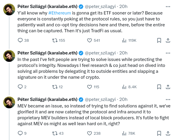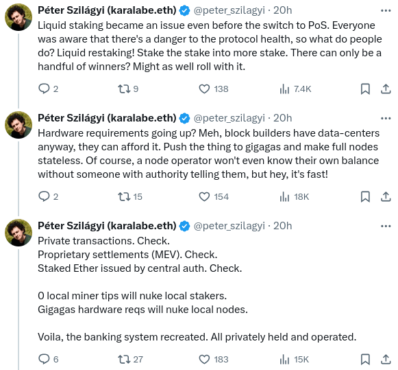 Given this greater technical capacity, one important question to be asking is: are we building toward the right goals? One prompt for thinking about this is a recent series of unhappy tweets from the long-time Geth core developer Peter Szilagyi: